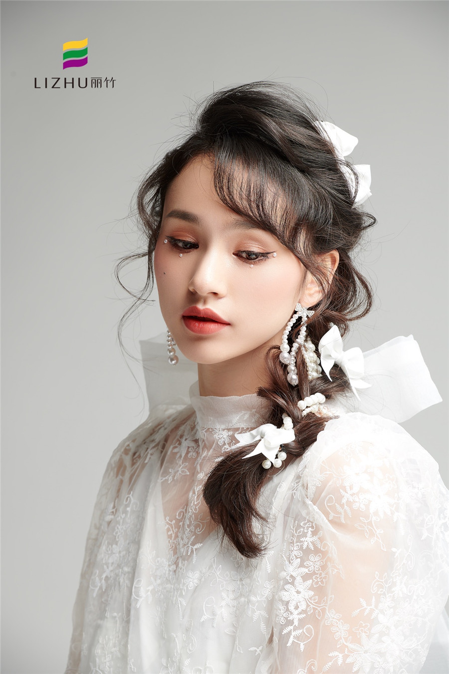 廣西化妝培訓(xùn)學(xué)校(麗竹化妝學(xué)校)---甜美時(shí)尚新娘造型:簡(jiǎn)約的便面編發(fā),搭配優(yōu)雅的白色蝴蝶結(jié)點(diǎn)綴。素雅動(dòng)人,甜美優(yōu)雅,無須濃墨重彩,即可打造氣質(zhì)恬靜新娘。