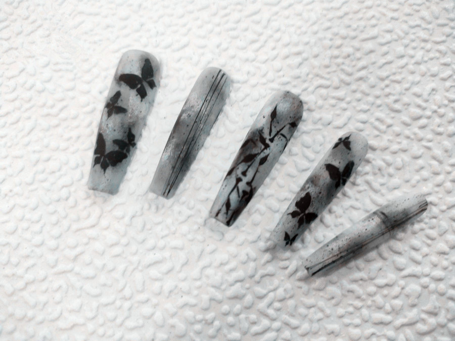 使用乳白色彩繪膠打底,蘸取黑色甲油膠在甲面上隨意鋪展開,然后在慢慢進(jìn)行自然過渡的暈染,打造色彩在水面暈開的感覺。之后在用彩繪筆畫出黑色蝴蝶圖案及其他點(diǎn)綴圖案,蕞后涂上磨砂封層,使得整副作品的圖案更加逼真,蝴蝶仿馬上就要翩翩起舞,看起來很有靈氣。同時(shí)也將經(jīng)典的文雅氣韻躍于“指”上。