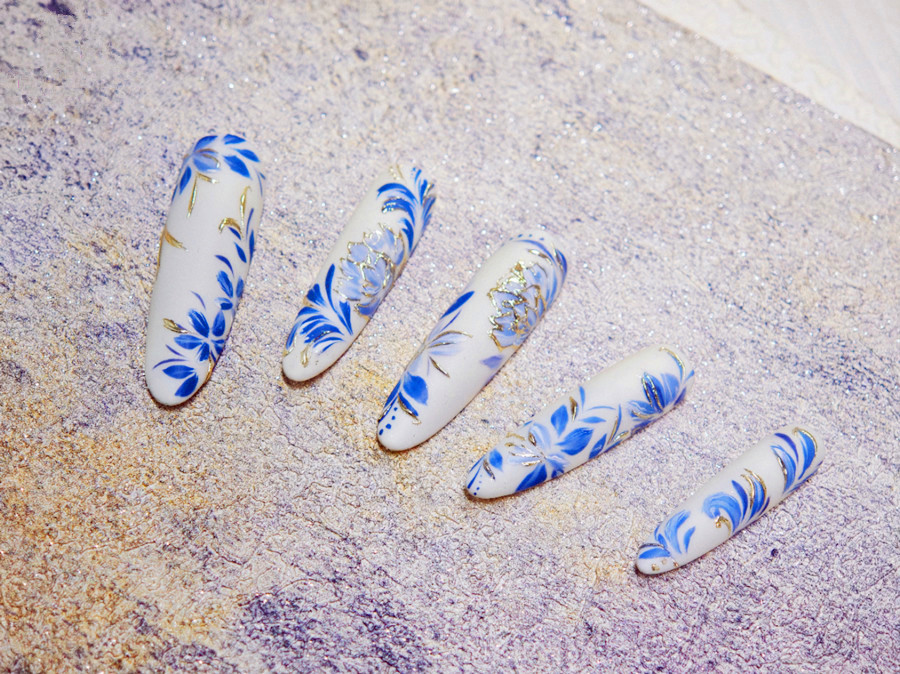 整副美甲作品,汲取國(guó)風(fēng)經(jīng)典青花元素作為整副美甲的主體。以乳白色作為底色,再涂抹磨砂封層增加質(zhì)感。之后,用彩繪筆繪畫(huà)出花瓣,蘸取金屬膠勾勒花瓣邊緣,打造古典國(guó)風(fēng)氣息的同時(shí),更添加了幾分雅韻。