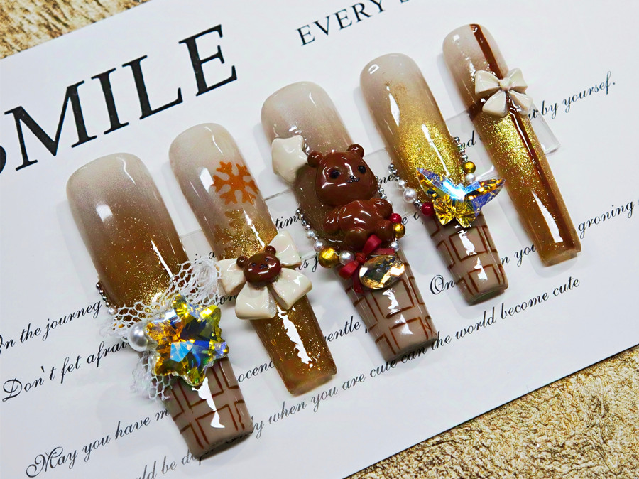 使用雕花膠慢慢揉搓出小熊身體的哥哥部位,然后在慢慢拼湊,描繪上喜歡的圖案和顏色,一個活潑可愛的細心立體卡通形象就完成了。之后在點綴一些蝴蝶結(jié),珍珠,鉆石等亮閃閃的飾品,甲片也在金屬膠與暈染甲面的相互映襯,變得星光熠熠。這樣一款極具童趣有精致感滿滿的巧克力熊雕花美甲就完成啦!