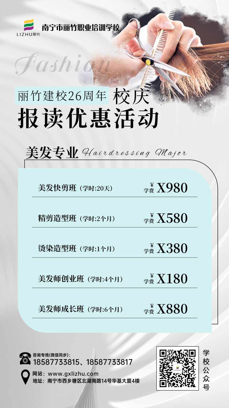 要是你還想獲取更多美發(fā)知識或是南寧美發(fā)資訊,亦或是想知道廣西美發(fā)學(xué)校哪家出名?相信廣西美業(yè)人對南寧美業(yè)職業(yè)培訓(xùn)學(xué)校(麗竹學(xué)校)一定不會感到陌生?,F(xiàn)在學(xué)校正在進行報讀優(yōu)惠活動,想學(xué)美發(fā)的小伙伴趕緊報名吧!