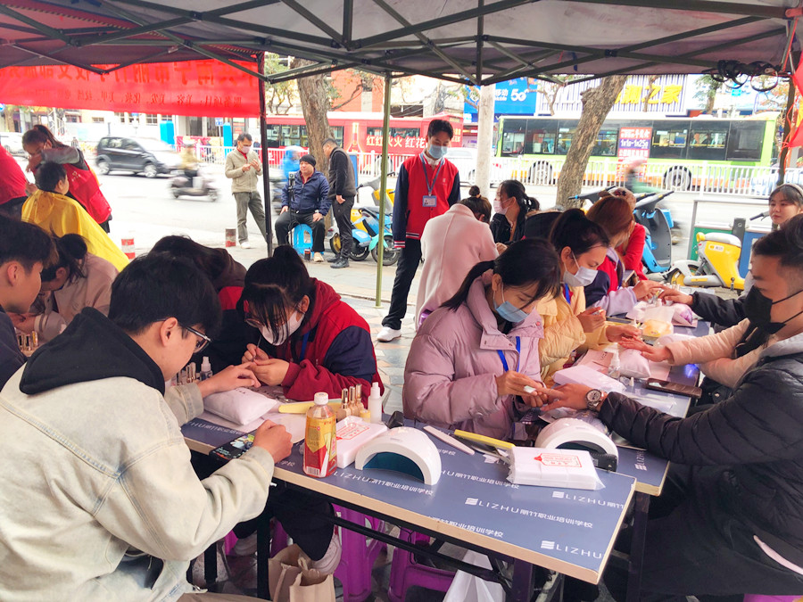美甲活動免費、南寧美甲免費:3月是“學(xué)雷鋒月”,為了弘揚雷鋒全心全意,為人民無私奉獻的高尚精神,南寧美甲造型專業(yè)學(xué)校(麗竹美甲學(xué)校)組織志愿者在北湖南路華基大廈門口的小廣場上為群眾進行免費美甲活動。