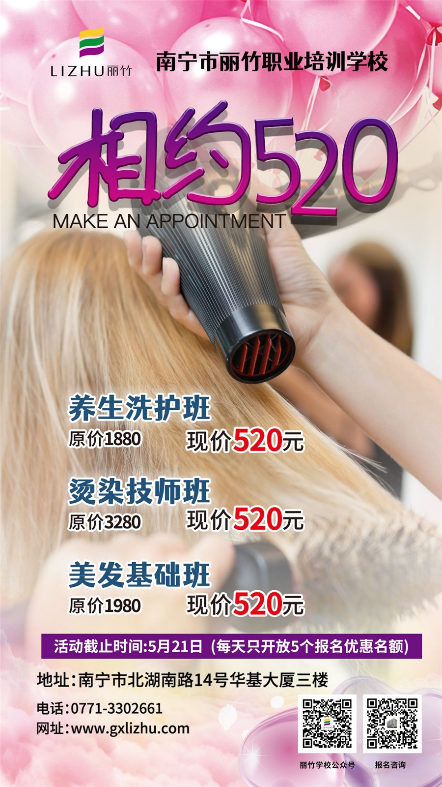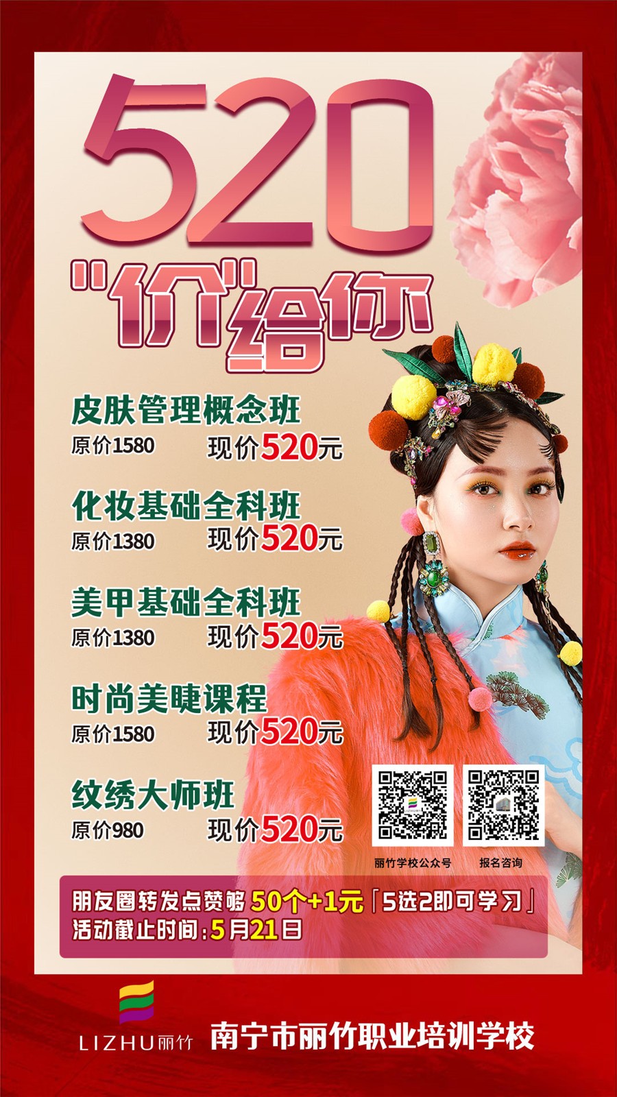 麗竹學(xué)?!?20告白季”重磅推出5大“美麗護(hù)膚系列”課程,原價值3160元的培訓(xùn)項目,轉(zhuǎn)發(fā)朋友圈點贊集50個 + 截圖保存,只需520+1元,即可從5門課程選2門學(xué)習(xí)?;顒訒r間為:5月20日當(dāng)天報名的29個名額