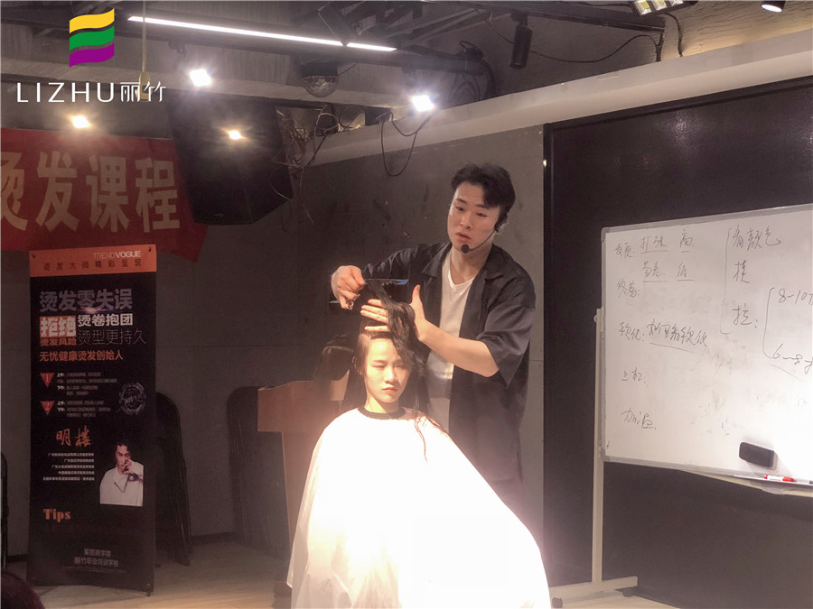明樓老師現場進行燙發(fā)真人實操,示范造型剪裁手法技巧,教學員落地實用美發(fā)技巧