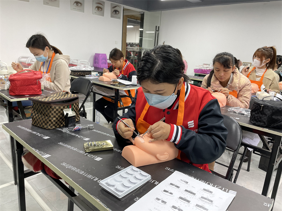 學(xué)員在假頭模進行嫁接睫毛練習(xí)