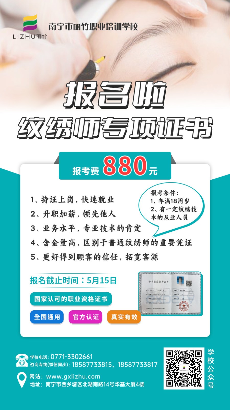 南寧美容師職業(yè)資格證書考試、南寧紋繡師專項證:注意啦!注意啦!在近期有想南寧考美容師證,或是想知道南寧哪里可以考紋繡師證的小伙伴們,南寧美業(yè)職業(yè)培訓學校-麗竹學??甲C班5月份報名活動正在火熱進行中,學位滿額即截止報名,所以請務必好好看看清以下海報的內容信息哦!